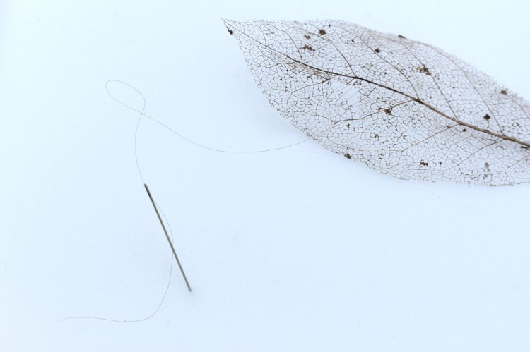 This is a leaf with a hole in it. One of Mariken’s hairs has been used to repair the leaf. Via this one simple act Mariken is attempting a grand gesture; to counteract mortality and to ask for forgiveness.